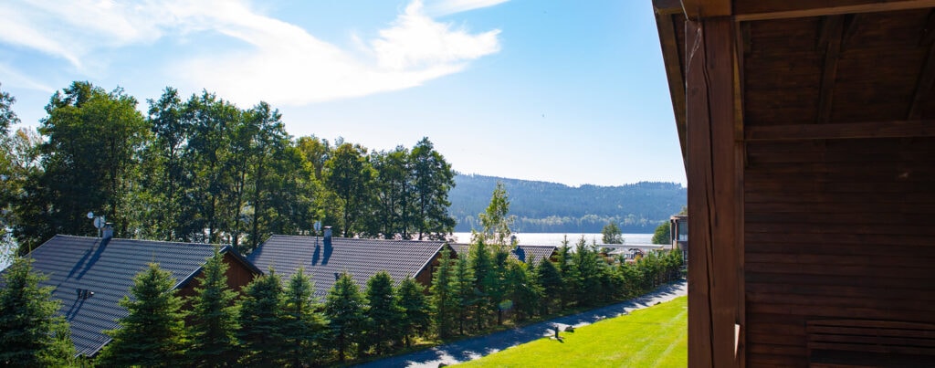 Neu renovierte Häuser mit Balkon und Sitzgelegenheit auf der Terrasse mit Blick auf den Fluss Lipno. Einige dieser Häuser sind ideal für einen Familienurlaub, andere sind für einen Aufenthalt mit einem Haustier geeignet.