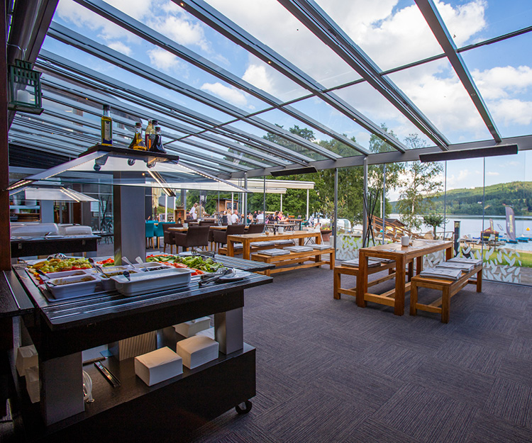 Nekuřácká restaurace s krbem, bowlingem, dětským koutkem a prostornou venkovní terasou s výhledem na Lipno. Ochutnejte speciality regionální kuchyně a čerstvá polední menu laděná podle ročních období a sezónních surovin od místních dodavatelů.